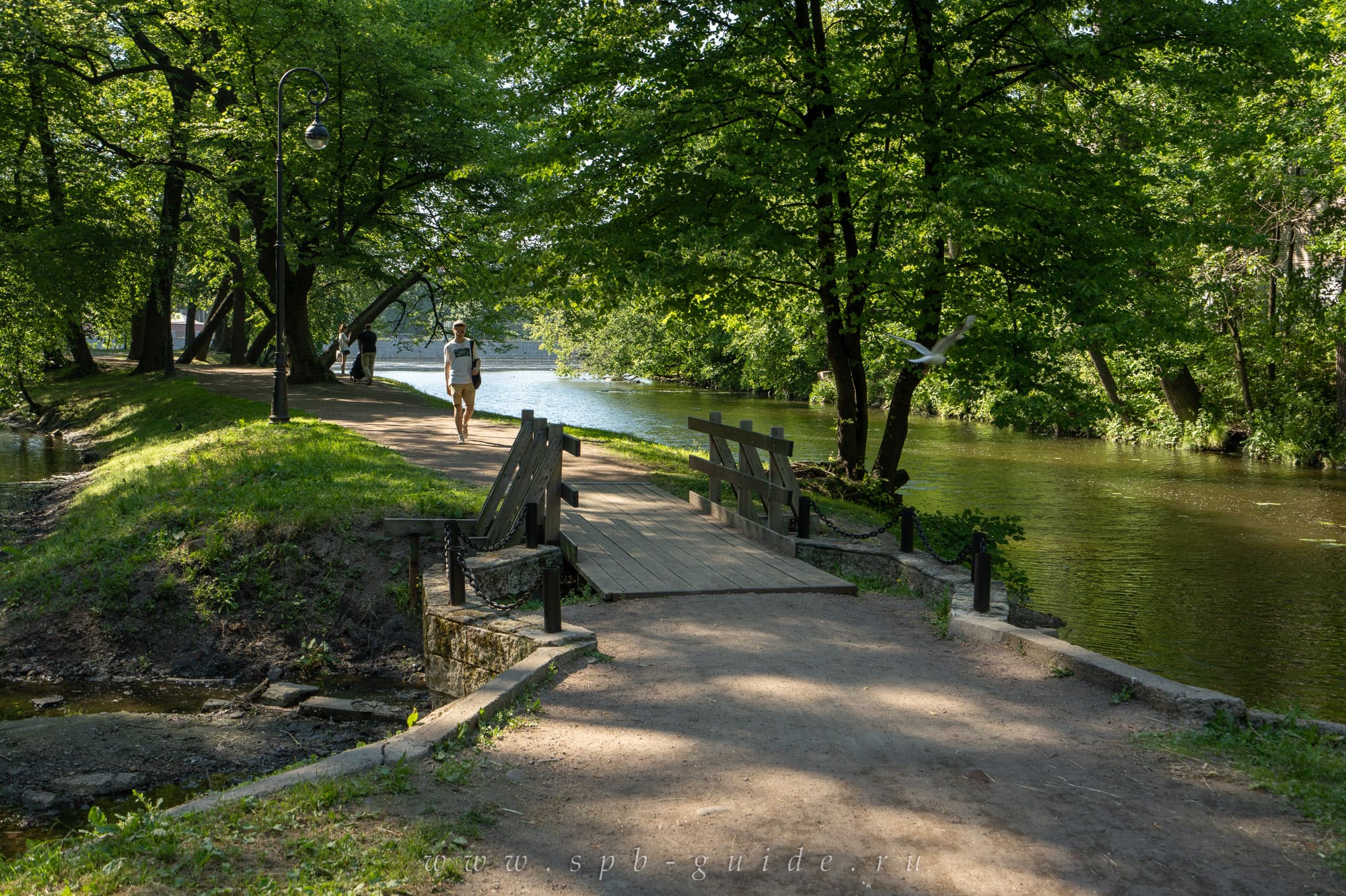 Рядом есть кафе и точки с едой плюс прокаты — от велосипедов до сапов. Последнюю активность, кстати, особенно рекомендуем попробовать летом именно тут. Маршрут интереснейший и проходит прямо под Живописным мостом. Ну вы посмотрите, какая красота!