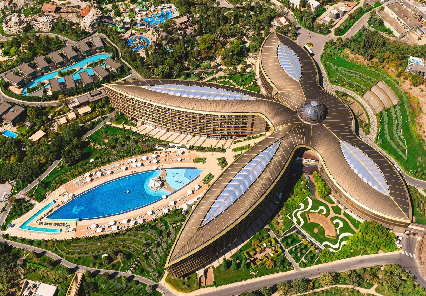 Архитектуру курорта проектировал британский архитектор Норман Фостер. Он сделал всё, чтобы вы почувствовали себя здесь немного отрешёнными от мира. Захотели — пошли поплавать в море или прогуляться по японскому саду, где весной цветёт сакура. Эх, богатая жизнь…
